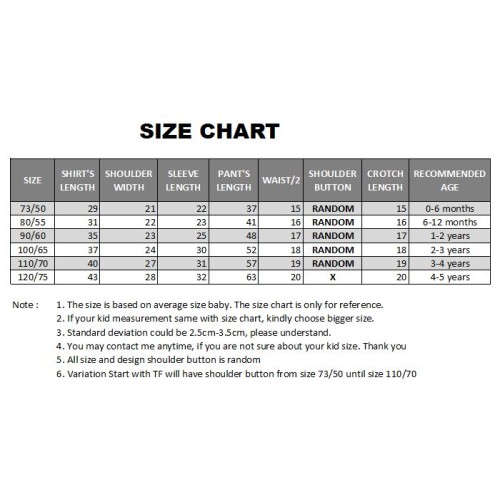 * Cadangan umur dan berat badan hanya sebagai rujukan sahaja, Sila Rujuk Carta Saiz (Size Chart) atau pilih saiz lebih besar.