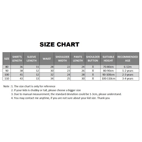 *Carta Size dan rekomendasi umur hanya sebagai rujukan sahaja, Sila Rujuk Carta Saiz (Size Chart) atau pilih saiz lebih besar.